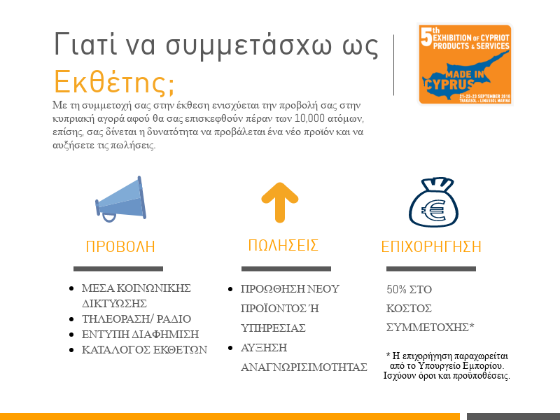 Αρχική Σελίδα ⁄ Εκθέσεις ⁄ Έκθεση Made in Cyprus | 27-29 Σεπτ 2019 ⁄ Made in Cyprus 2018 ⁄ Πληροφορίες για Εκθέτες